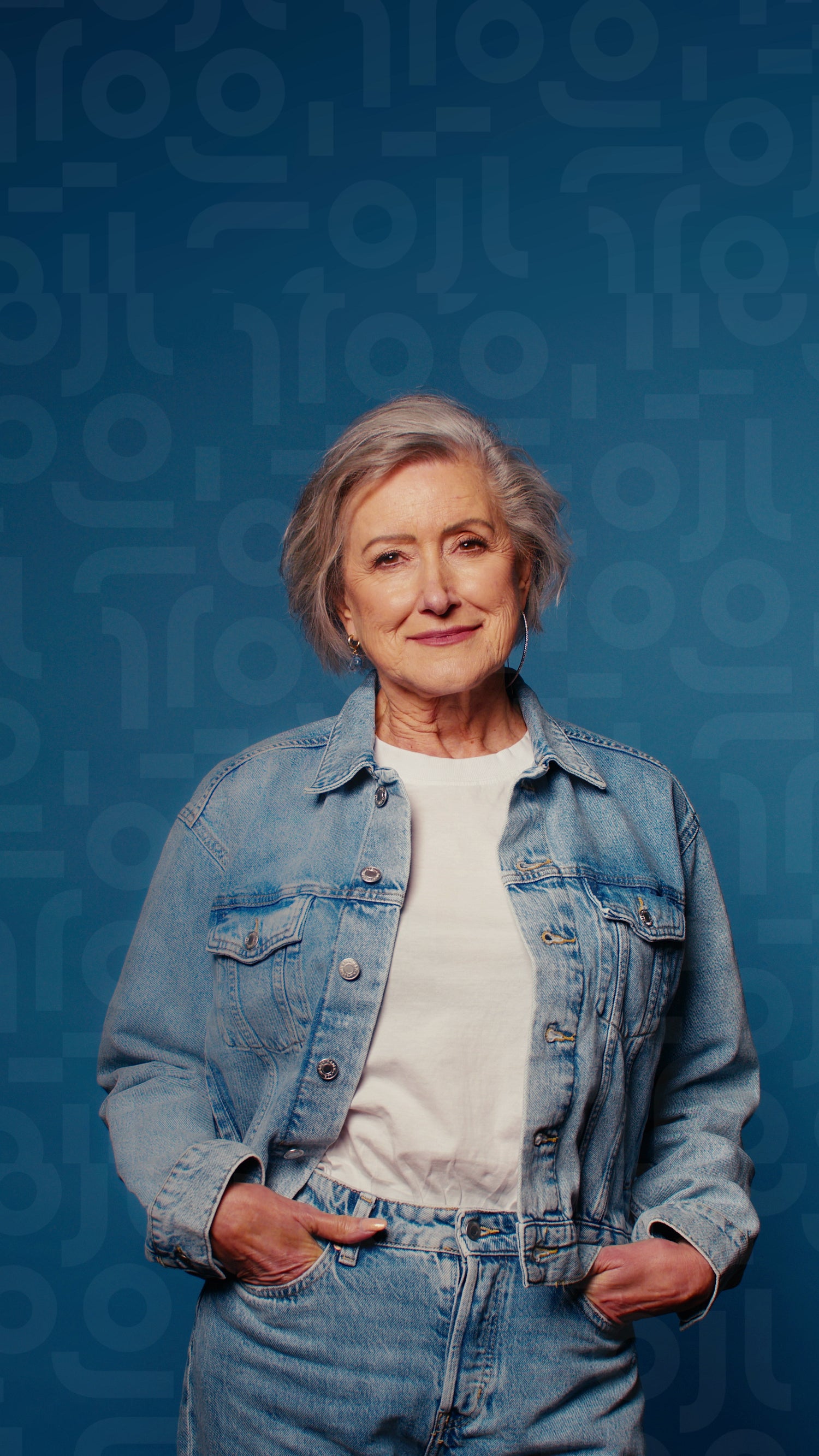 Stylish senior woman in denim jacket and jeans posing confidently on a blue background