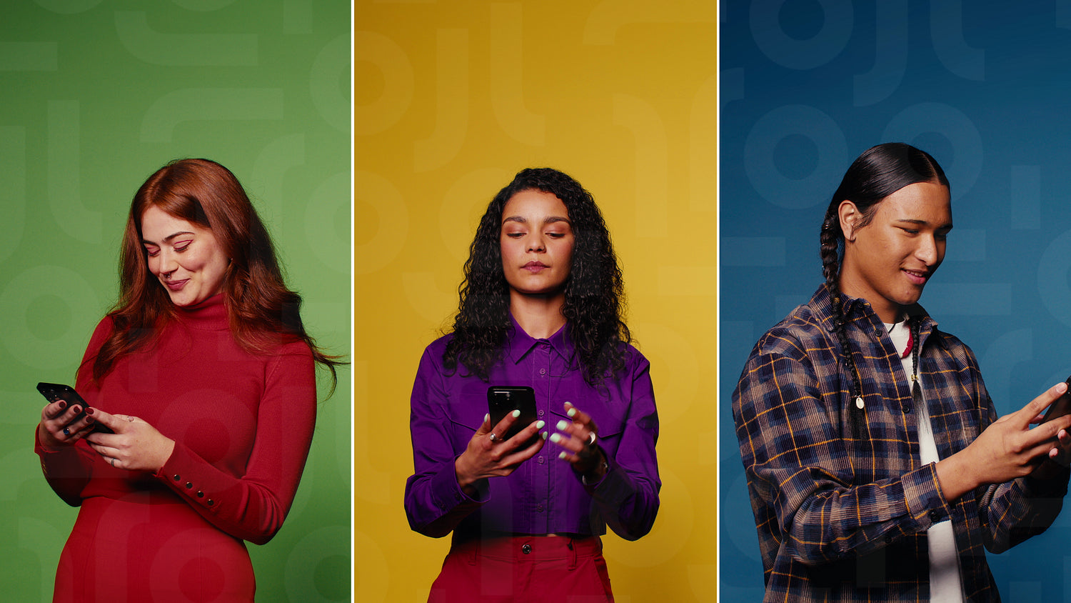Three diverse people smile and laugh as they interact with their smartphones against colorful backdrops.