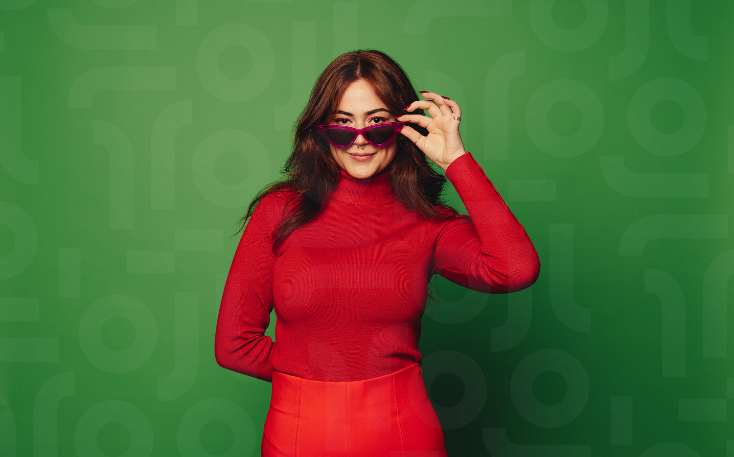 Stylishly trendy, a woman stands in a studio amongst vibrant colors of green and red. Peeking playfully, she sports casual clothing, fashionable glasses, sweater, and a happy smile.