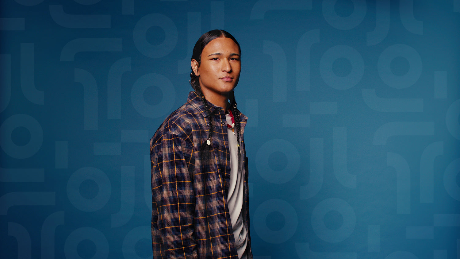 Young man with braids smiles at the camera in a medium shot against a blue backdrop. He wears a plaid shirt and a white t-shirt.