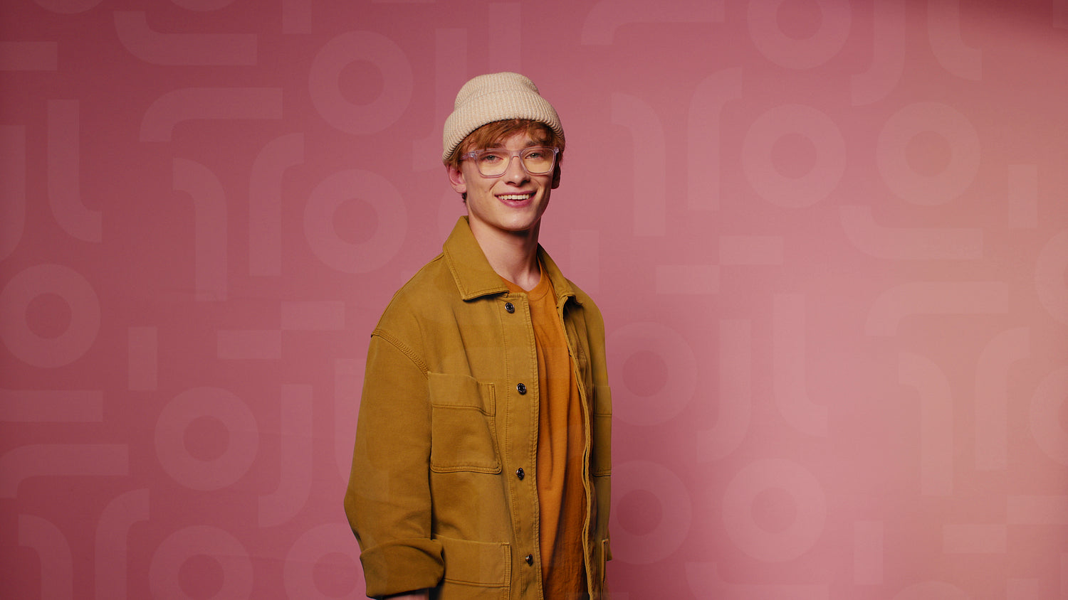 Young stylish man smiles against a pink background in a medium shot