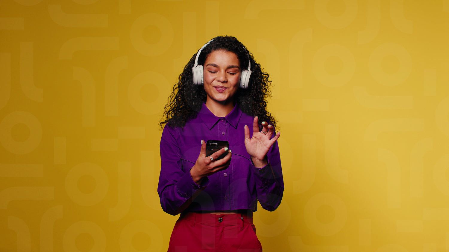 Carefree young woman dances and enjoys music on her phone while wearing white headphones against a vibrant yellow background.