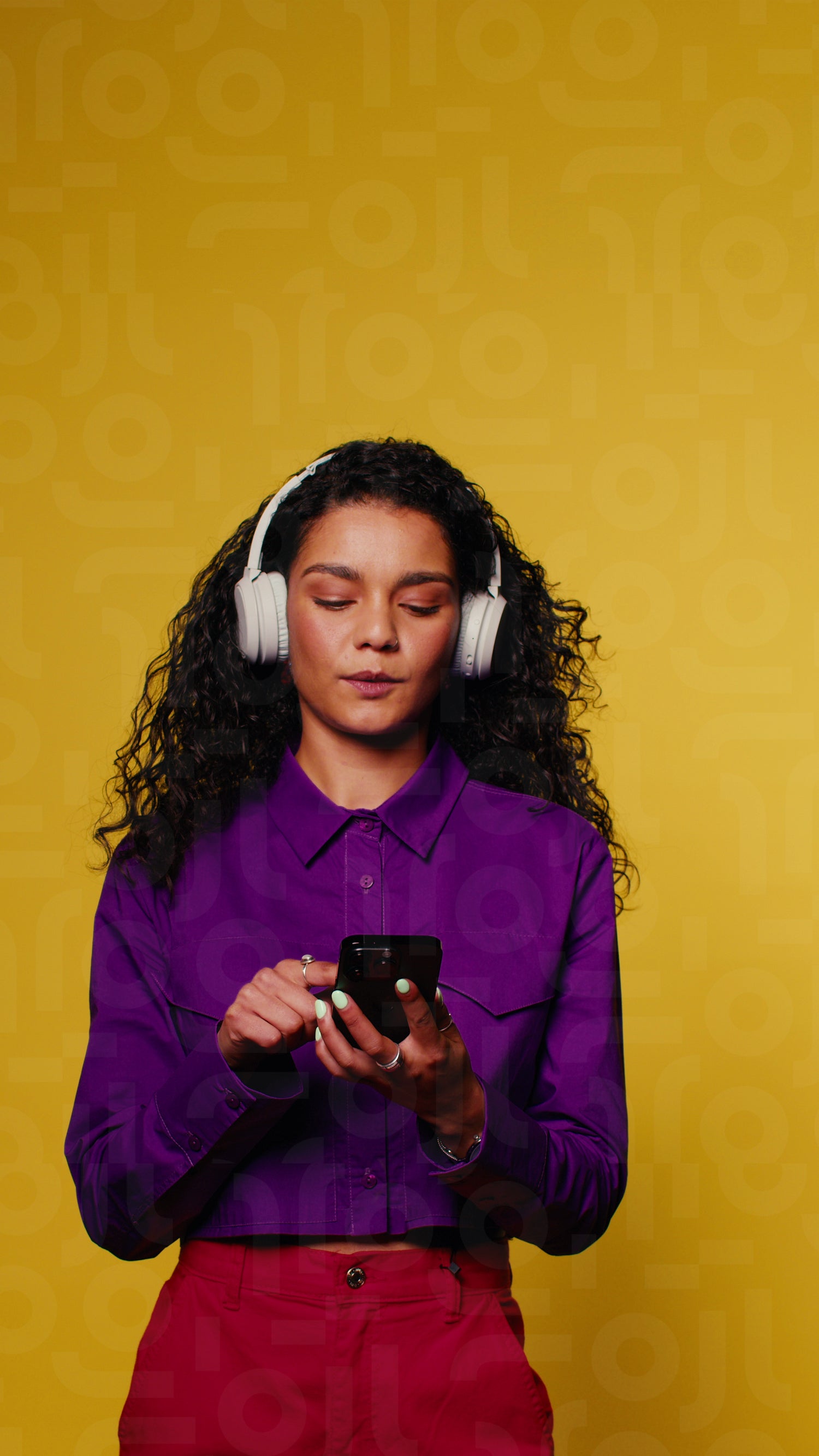 Young woman with curly hair dances and enjoys music on her phone while wearing headphones against a yellow background.