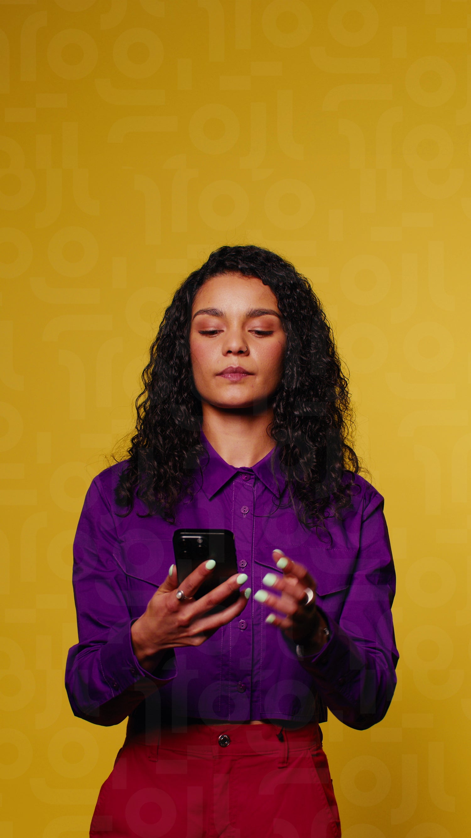 Young woman with curly hair smiles and laughs at her phone against a yellow background in a vertical medium shot