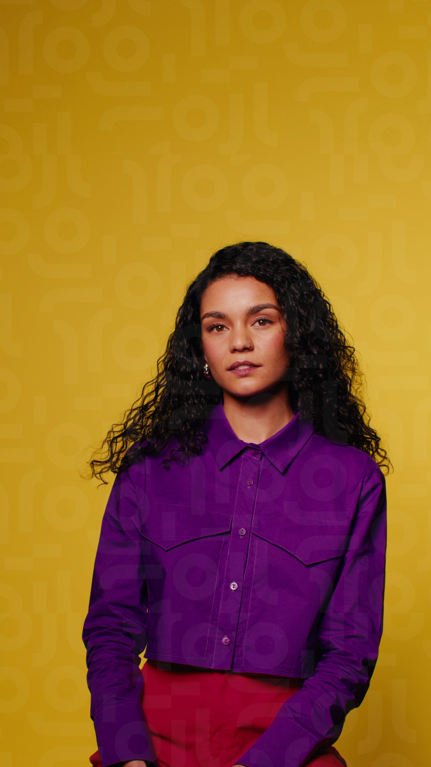 Confident young woman smiles and looks directly at the camera in a medium close-up shot against a vibrant yellow backdrop.