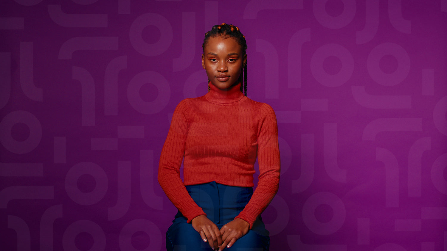 Young black woman with braids sits calmly, looking directly at the camera against vibrant purple backdrop, a medium shot, landscape orientation.