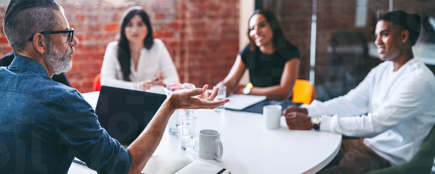Businessman leading a meeting in a modern office. Experienced mature businessman briefing his colleagues in a meeting room. Group of creative businesspeople working as a team.