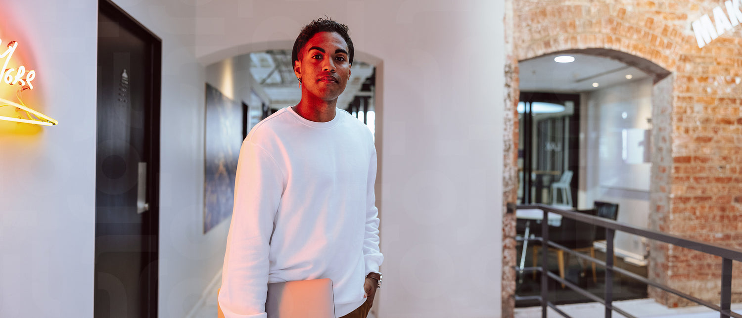 Businessman standing in a modern workplace. Confident young businessman looking at the camera while standing with a laptop in his hand. Creative businessman working alone in a modern office.