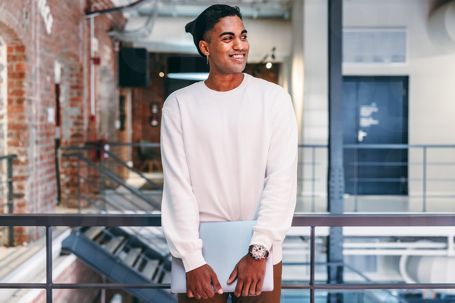 Businessman thinking of great new ideas. Happy young businessman looking away with a smile on his face while standing against metal railings in a modern office. Modern businessman standing alone.