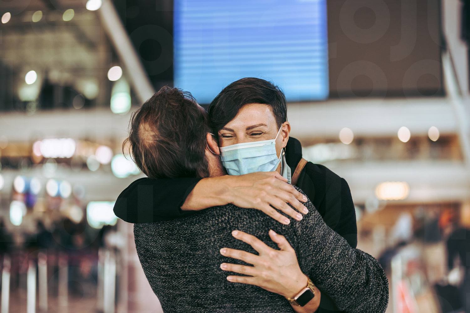 Husband and wife embracing at airport during pandemic. Woman in face mask welcoming her husband at airport during pandemic.