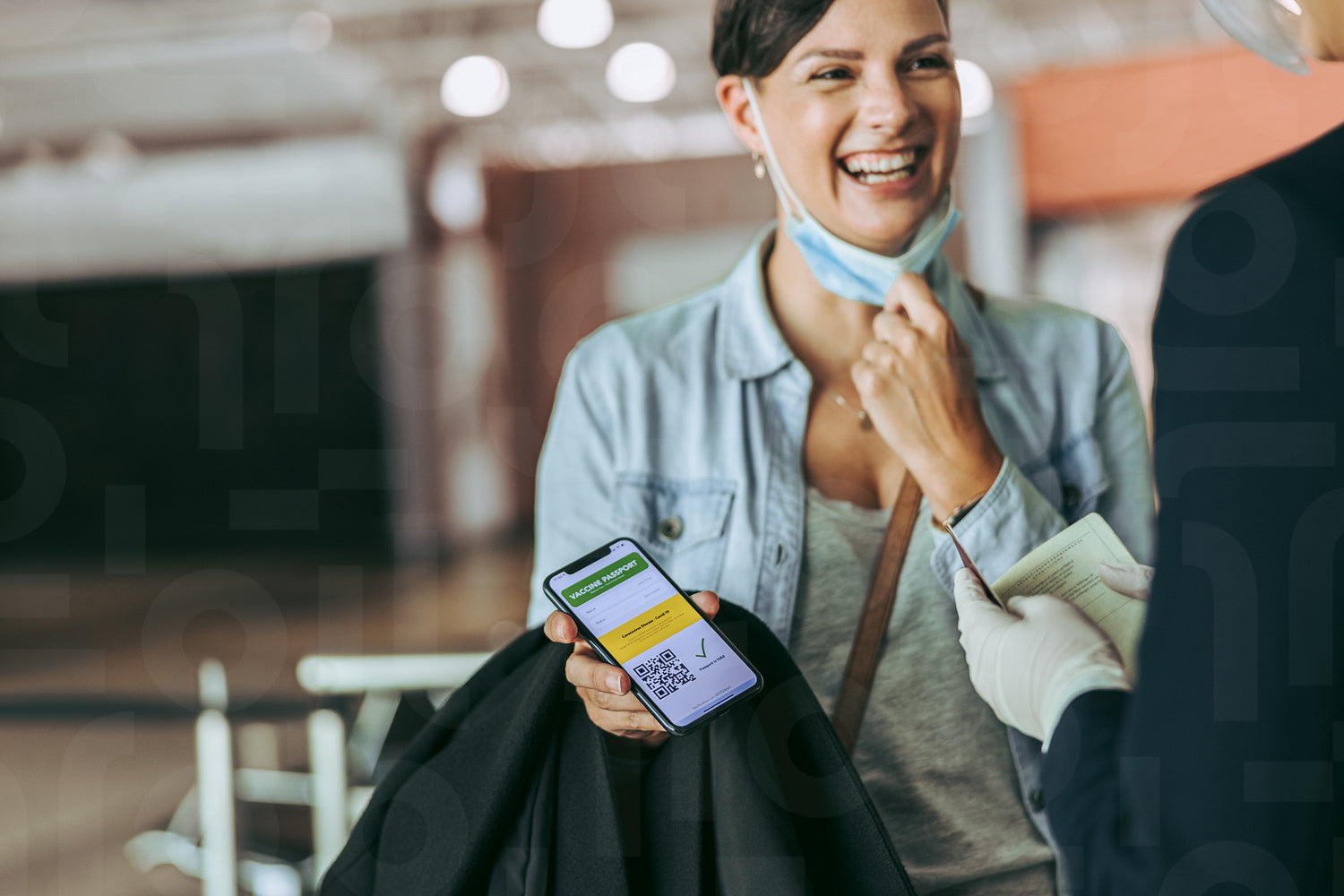 Smiling woman showing immunity passport to security at airport. Female at check-in counter showing her vaccine passport to the airline attendant.