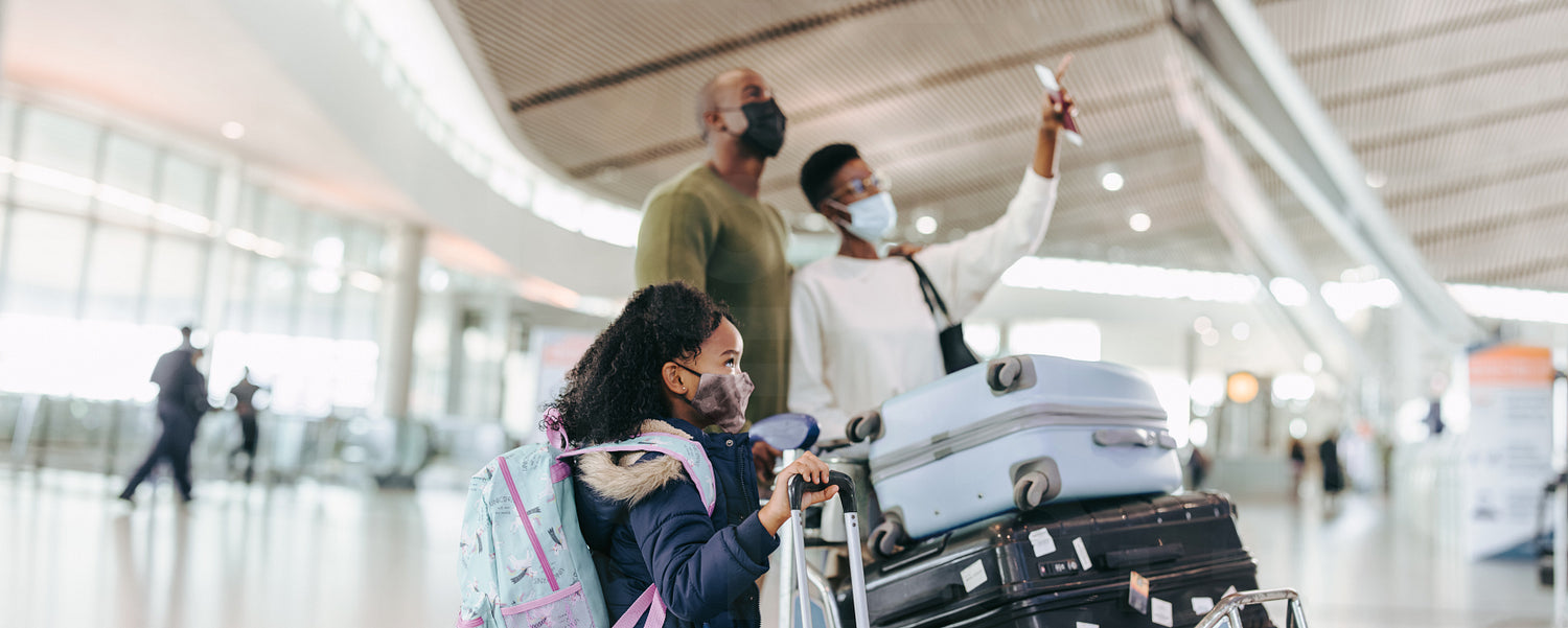 Mother showing something to her family at airport. Young daughter standing with luggage trolley and parents in background at airport during pandemic.