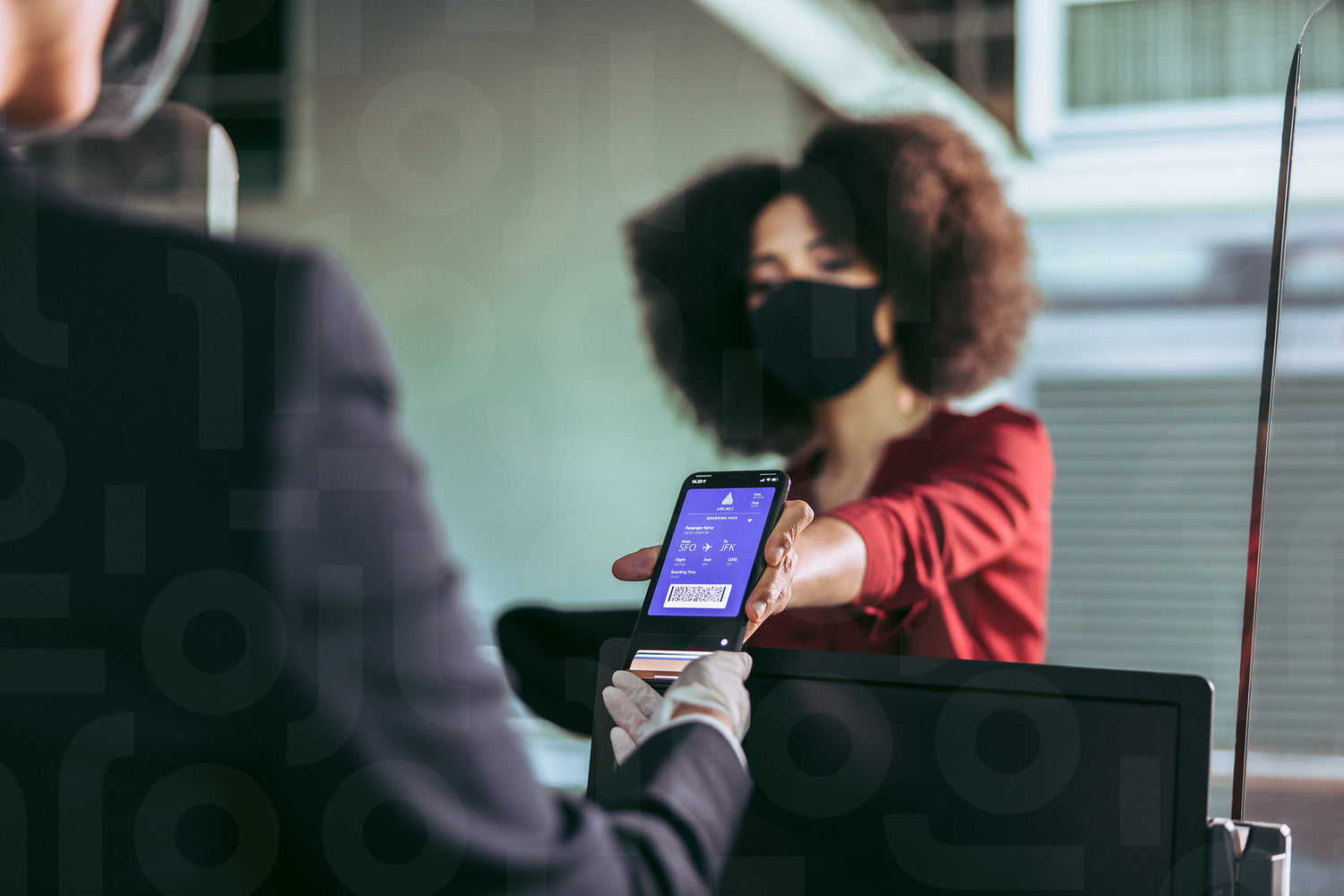 Female traveler wearing face mask showing her boarding pass to ground attendant at check-in counter at airport terminal. Passenger showing her electronic boarding pass on smartphone screen to airline attendant during pandemic.