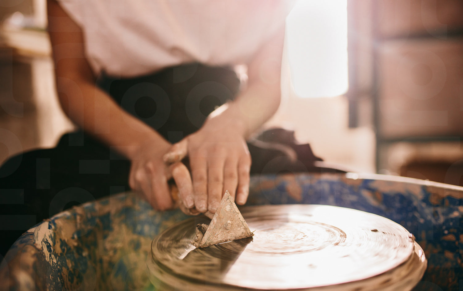 Woman potter cleaning the potters wheel using a triangular scraping tool. Craftswoman scraping clay from pottery wheel.