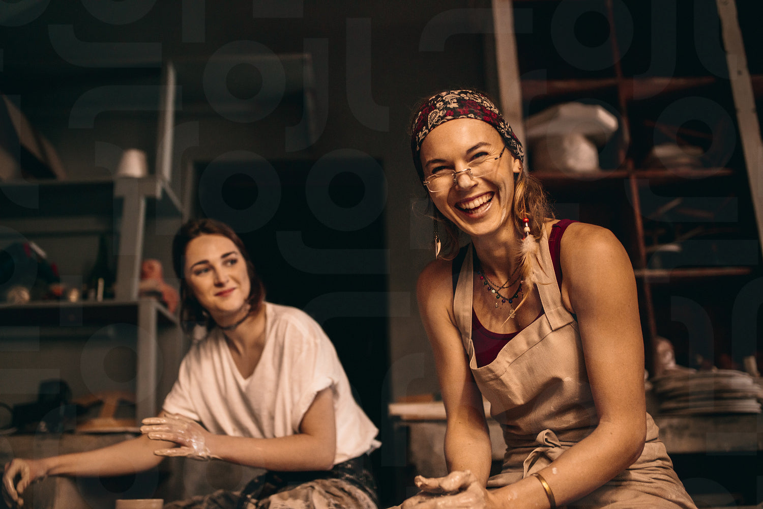 Two women making clay pots on potters wheel at workshop. Cheerful women enjoying the art of pot making at pottery workshop.