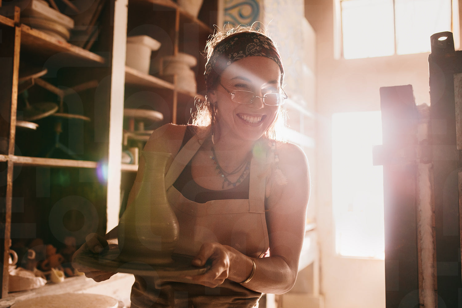 Happy woman potter holding a completed clay pot in hands. Joyful woman after making a clay pot at the workshop.