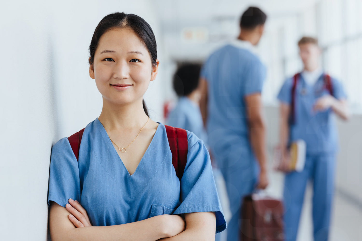 Asian nursing student standing in a hospital in medical scrubs, looking at the camera with confidence. Young female student doing her training as she studies to become a nurse.