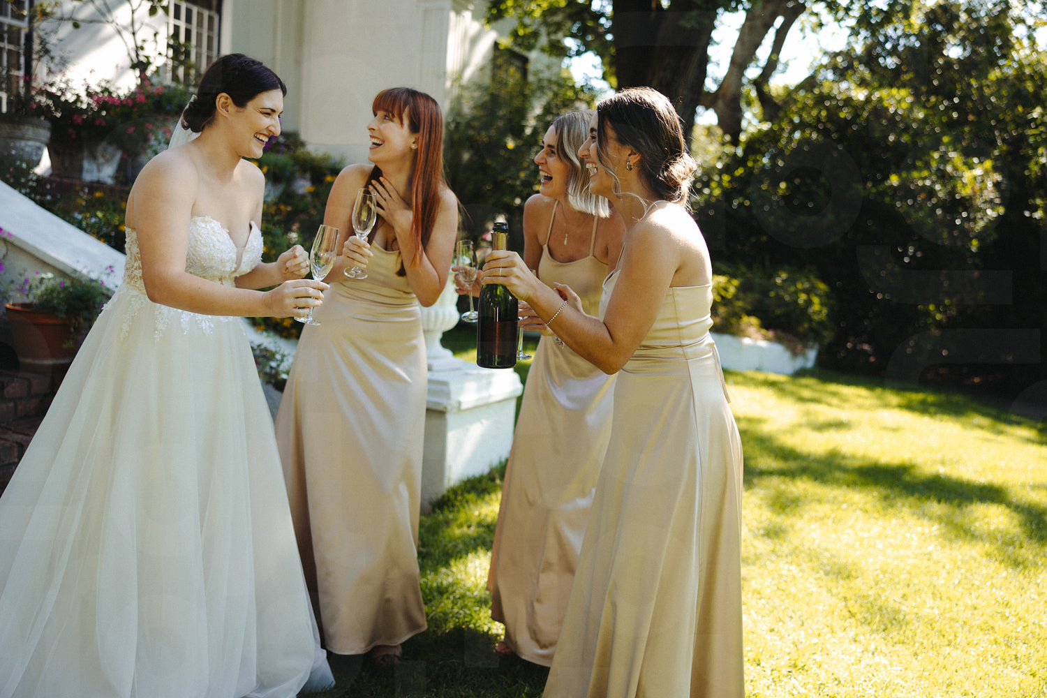Bride and bridesmaids laughing with champagne at outdoor wedding