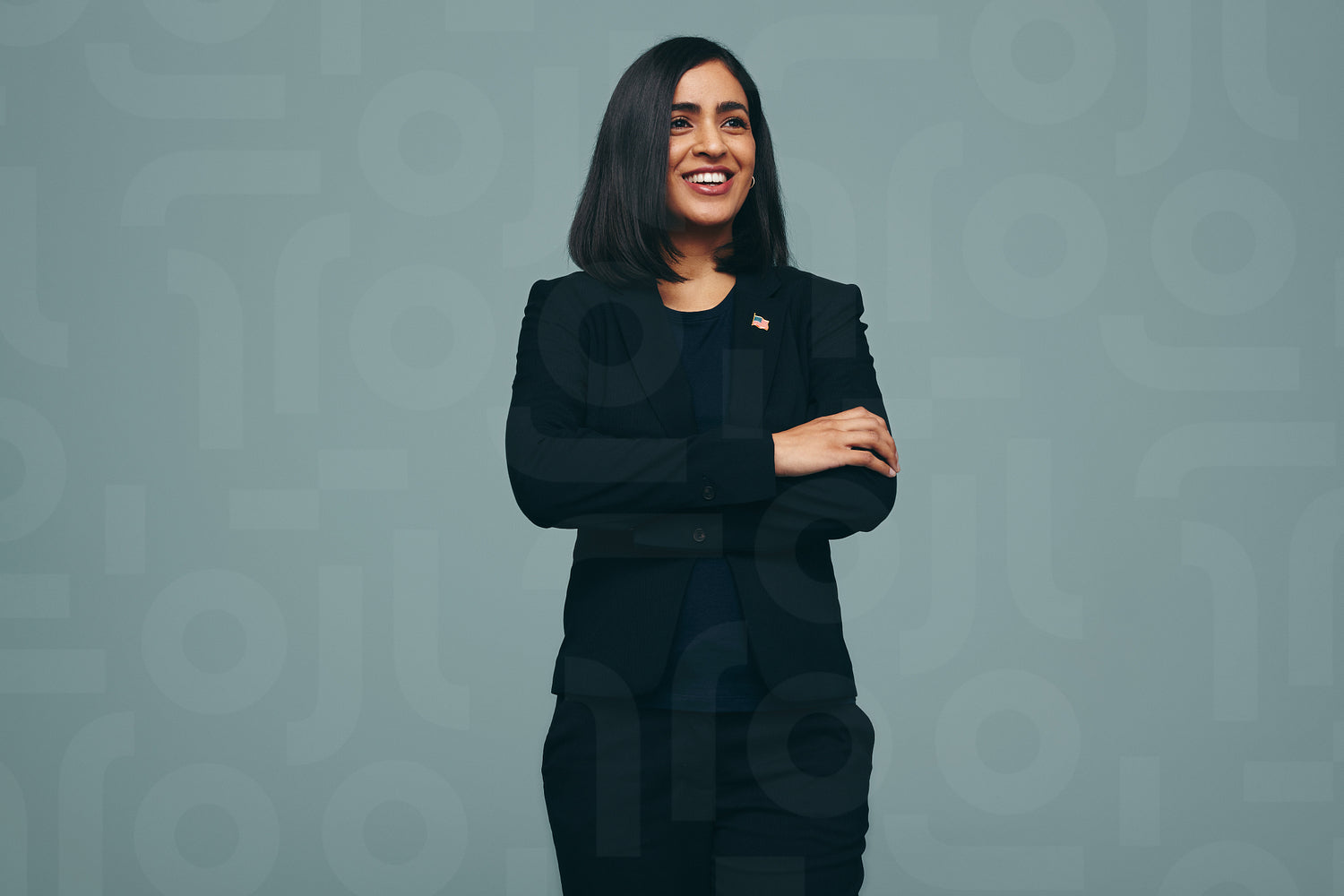 Cheerful United States congresswoman smiling happily in a studio. Young female politician standing with her arms crossed against a studio background.
