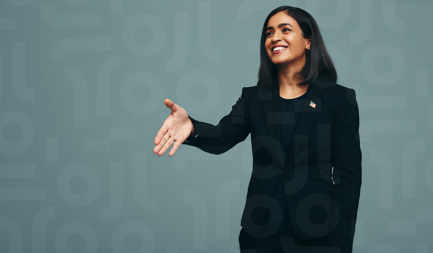 Friendly female politician holding out her hand for a handshake in a studio. United States congresswoman smiling cheerfully while standing against a studio background.