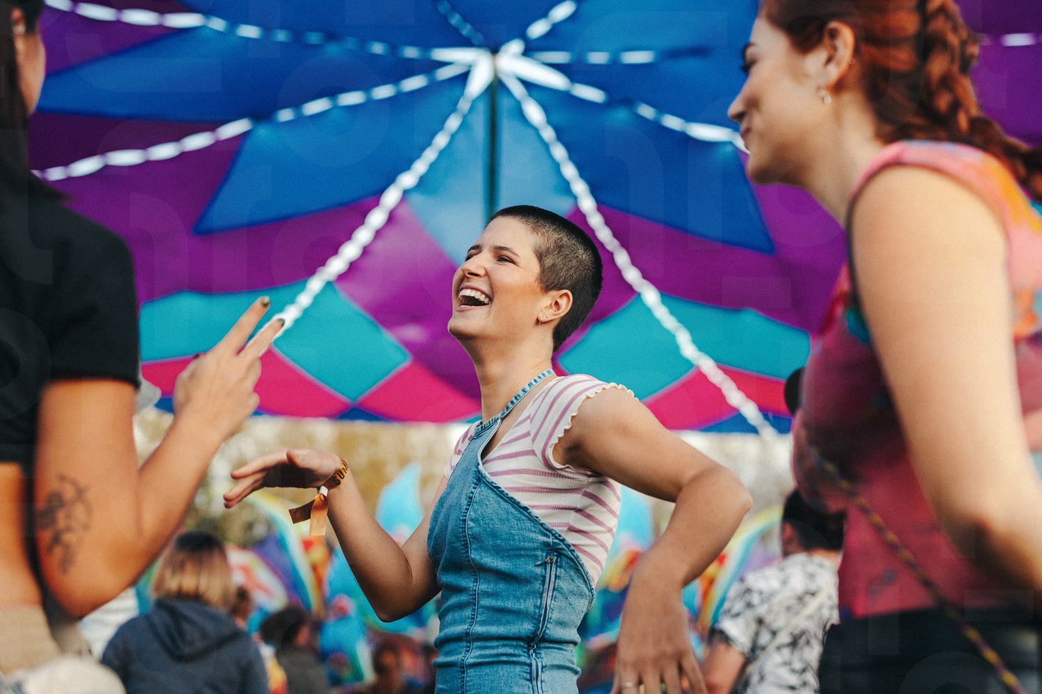 Friends unleash their inner dancers, moving and partying with infectious enthusiasm, as they have a fantastic time at the summer music festival. Happy young people having fun at a festival party. This photo has intentional use of 35mm film grain.