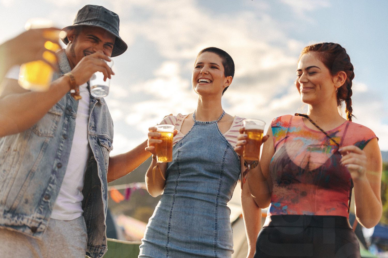 Friends have fun in the festival camp, sharing laughter and ice-cold beers, immersing themselves in the joyous atmosphere and embracing the carefree spirit of the event. This photo has intentional use of 35mm film grain.
