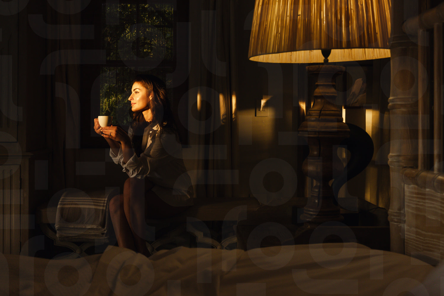 Serene young woman relaxing in her hotel room. Attractive young brunette woman having a cup of coffee in the dark. Young tourist woman enjoying a weekend getaway in a luxury hotel.