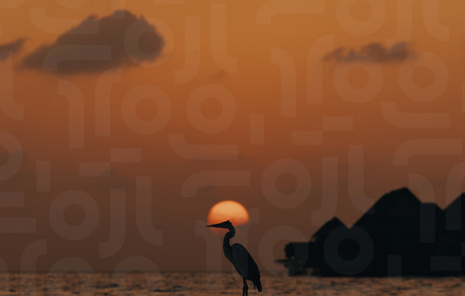A serene scene featuring the silhouette of a water bird standing gracefully against the vibrant sunset. The setting sun casts a warm glow over the island, enhancing the peaceful atmosphere.