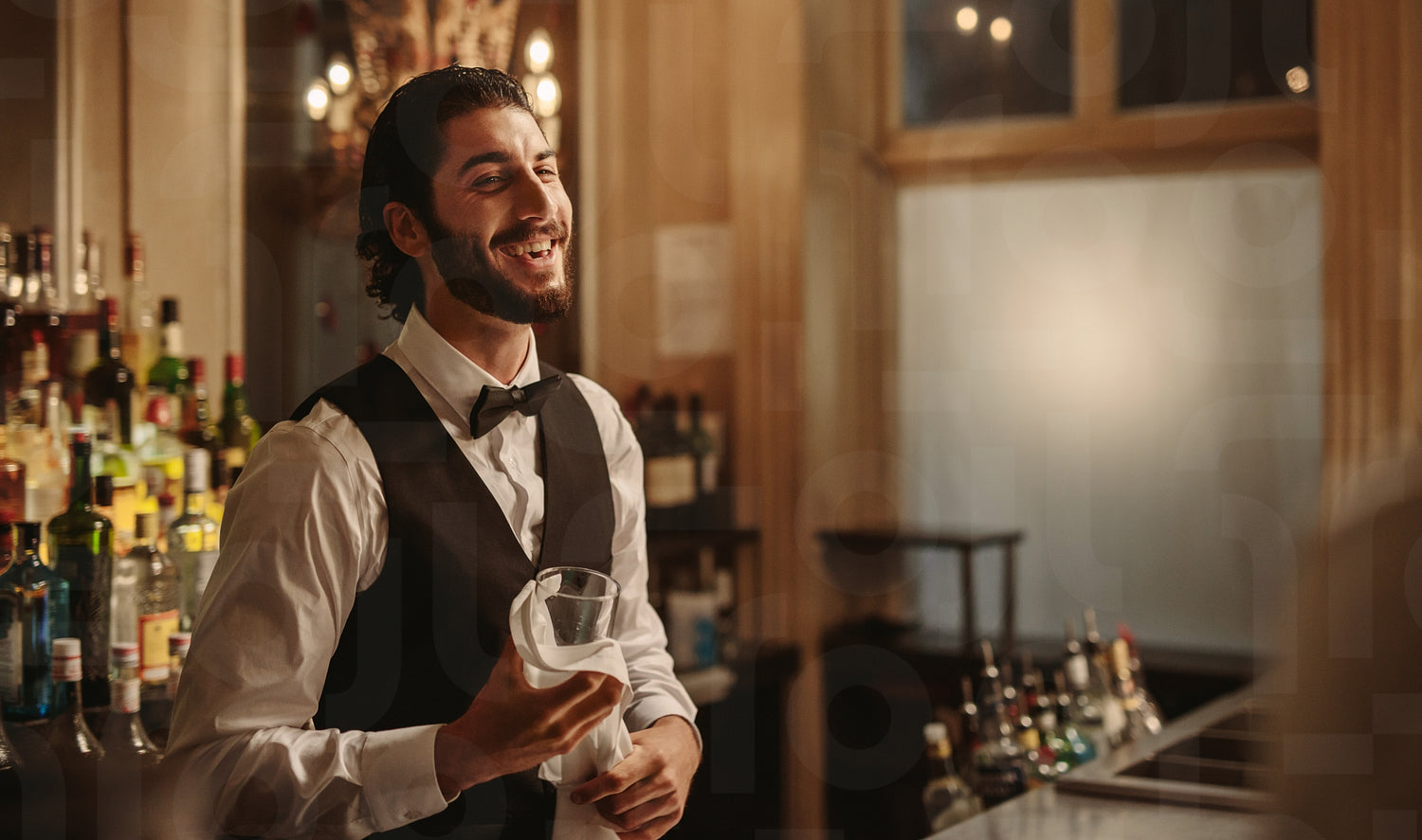 Smiling bartender cleaning glasses behind bar counter. Barman working at a night club bar.
