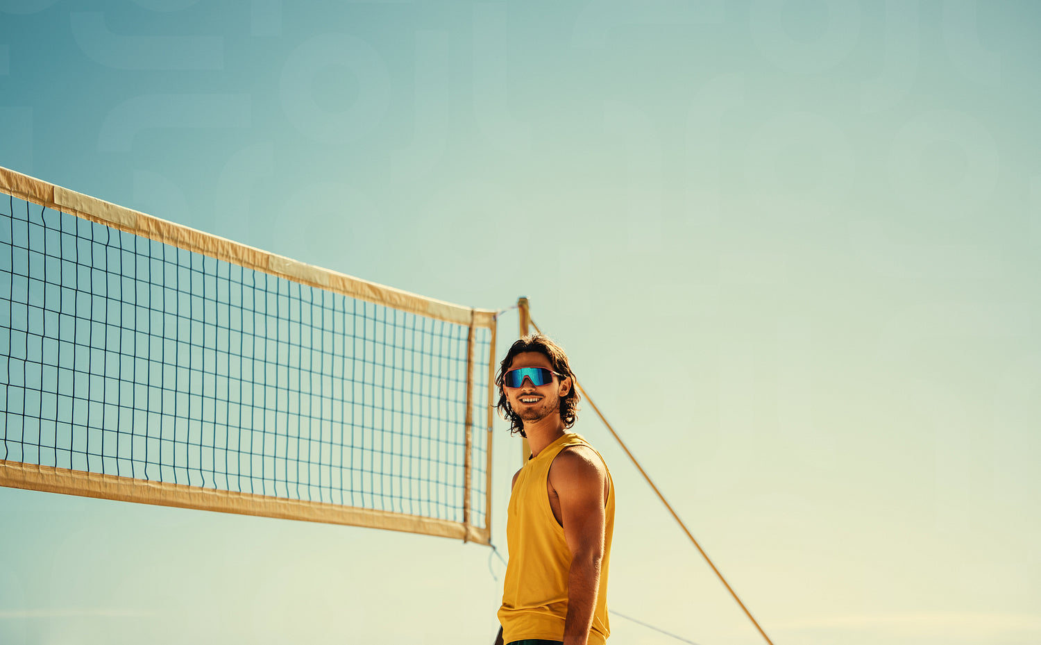 A smiling caucasian athlete competes in a beach volleyball championship, wearing sunglasses. The outdoor game takes place on a sunny day with a panoramic view of the coastal surroundings. The young man stands confidently, exuding a happy and professional demeanor.