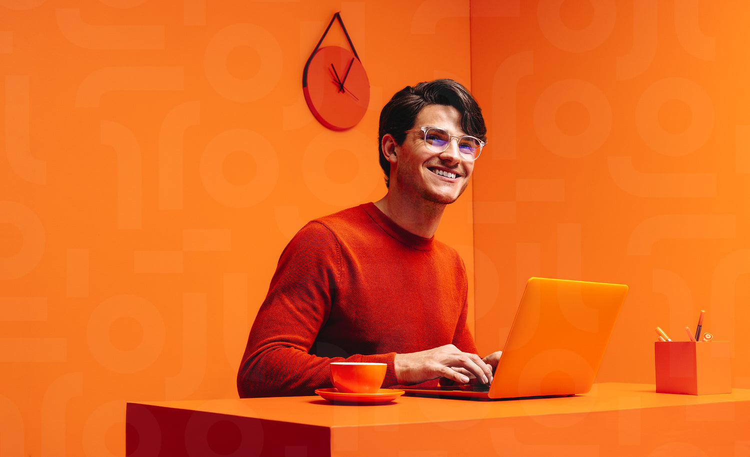 Smiling man working on laptop in a vibrant monochromatic orange office setting