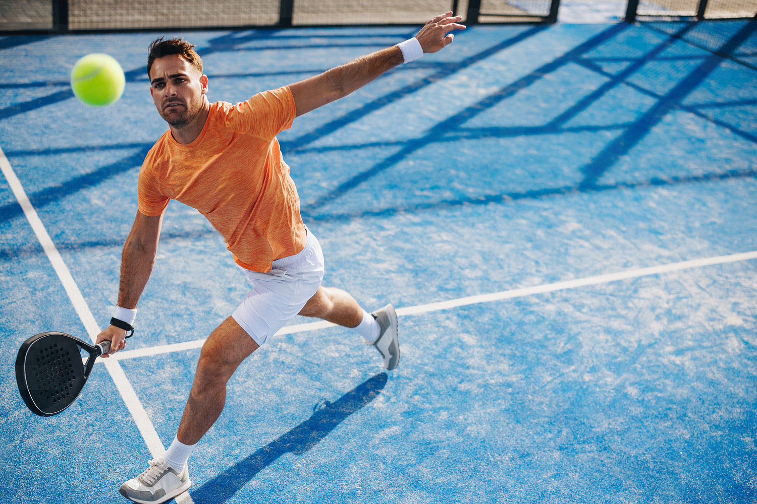 Padel athlete practicing his lob technique in a sports training session. Sportsperson working on his racket control skills as he prepares for future matches and tournaments. This photo has intentional use of 35mm film grain.