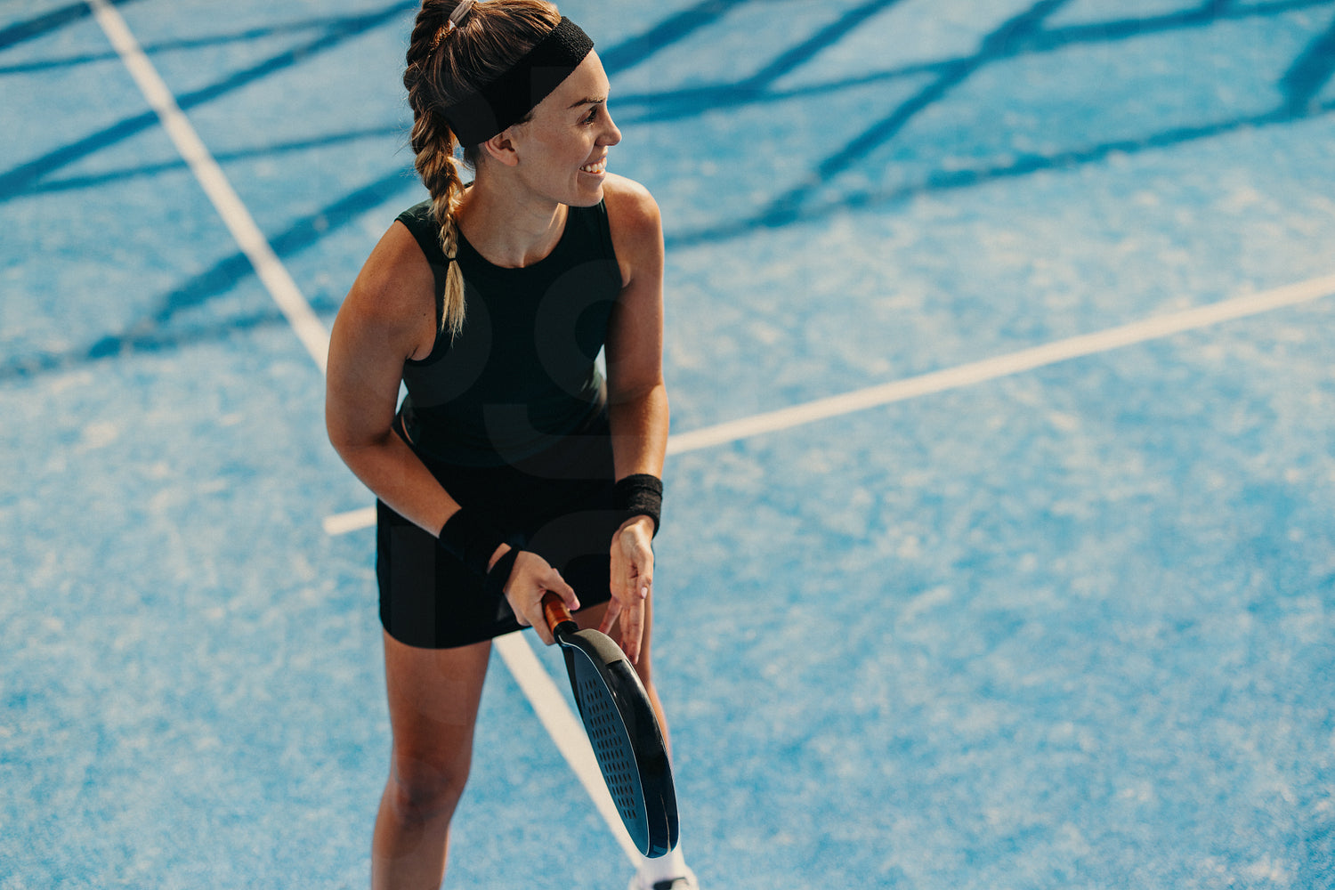 Sportswoman, ready for a match, standing on a padel court with a racket in her hand and a smile on her face. Female player waiting for the return of serve from her opponent in a competitive sports tournament. This photo has intentional use of 35mm film grain.