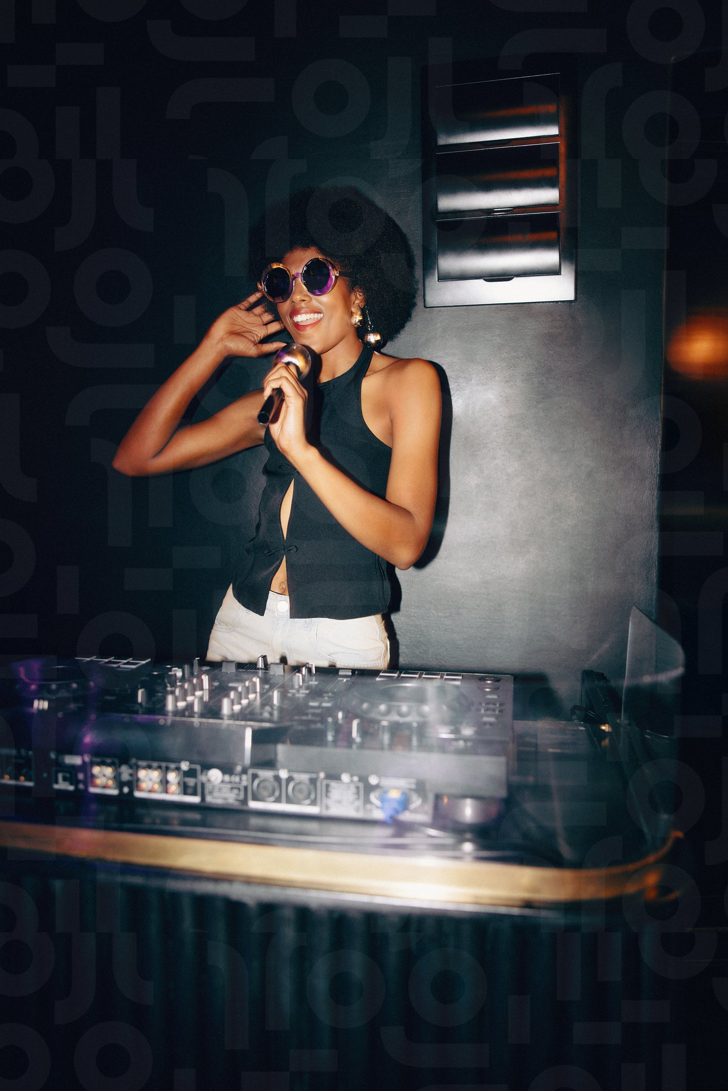 Stylish African female DJ holding a microphone at a lively nightclub event