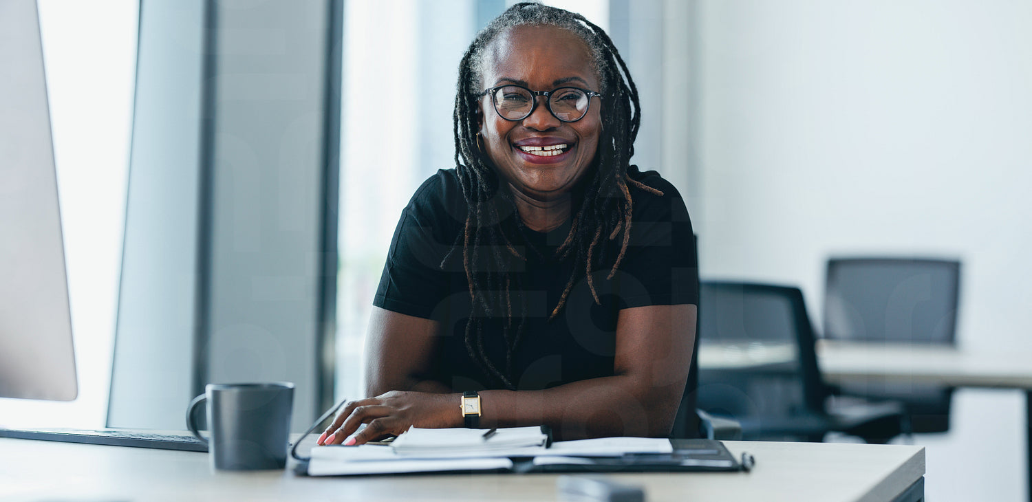 Successful business woman with dreadlocks smiles at the camera while sitting at her desk in an office. Confident and experienced African business woman working in a startup
