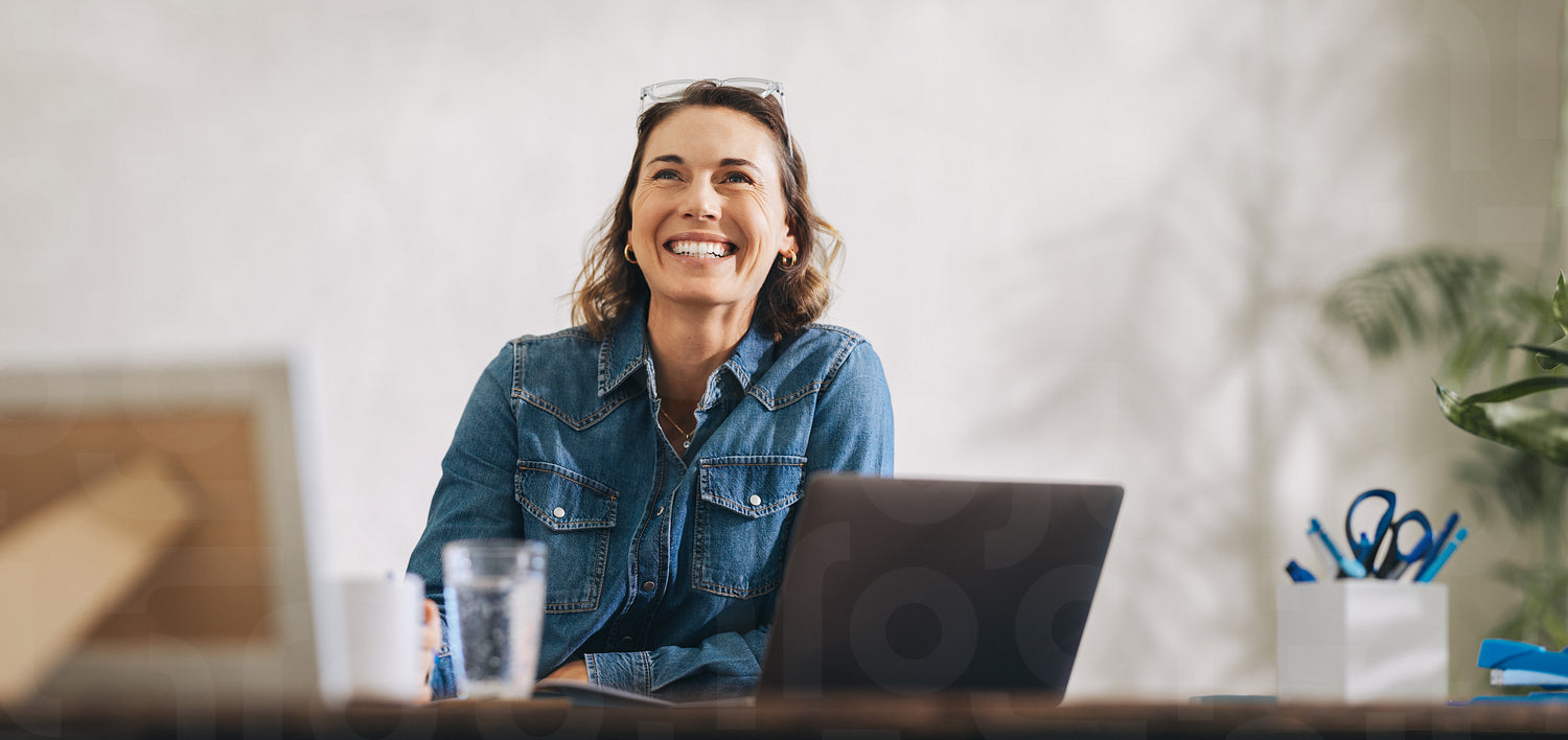 Successful business woman smiling while sitting at her desk in an office, reflecting on her accomplishments as an entrepreneur. Female business professional thriving in her field.