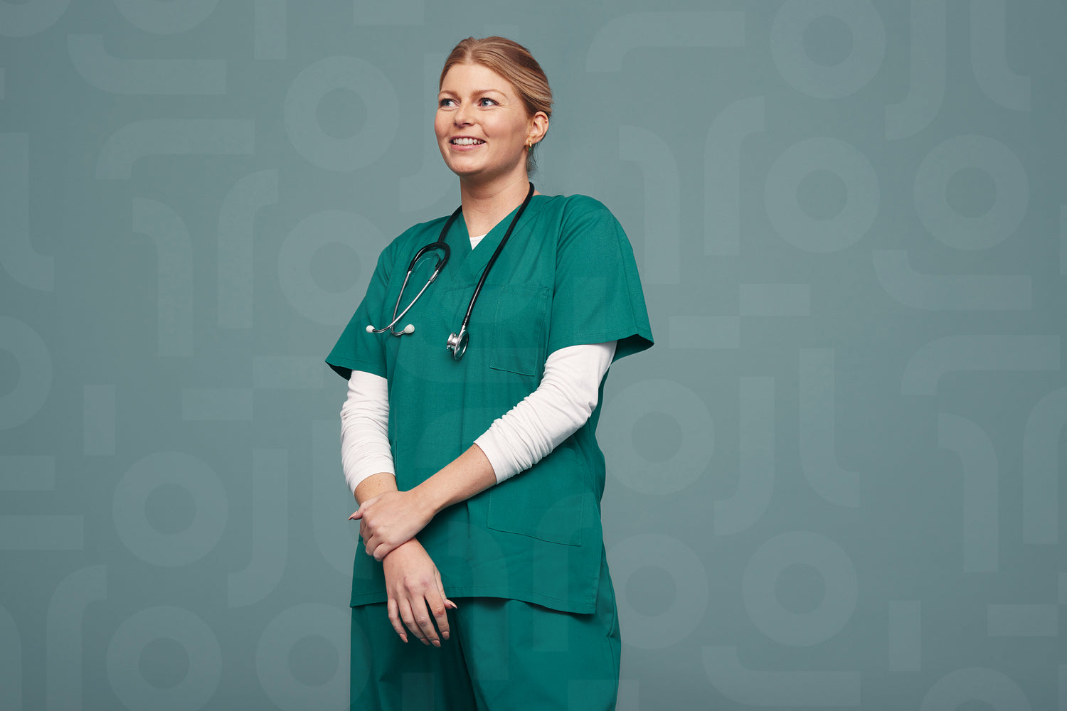 Successful female doctor smiling cheerfully while standing against a studio background. Happy young surgeon wearing green scrubs and a stethoscope around her neck.