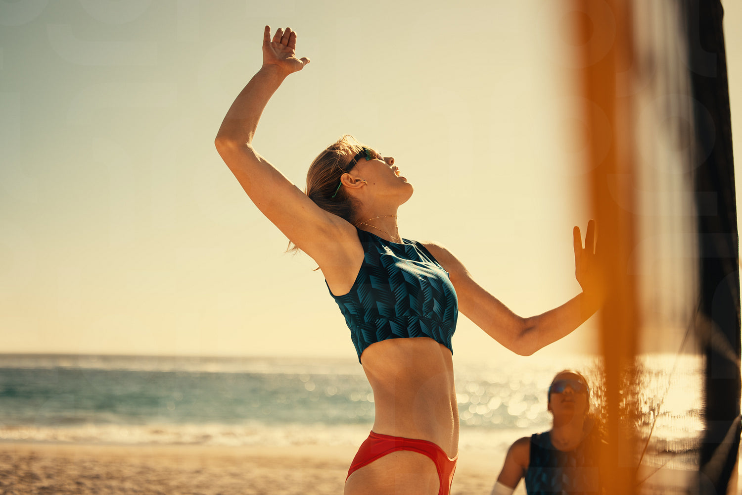Athletes in beachwear play intense beach volleyball on a coastal stretch. Team England showcases their prowess as the sun sets, jumping, blocking, and digging with precision. Action-packed image captures the energy of pro volleyball tournament.