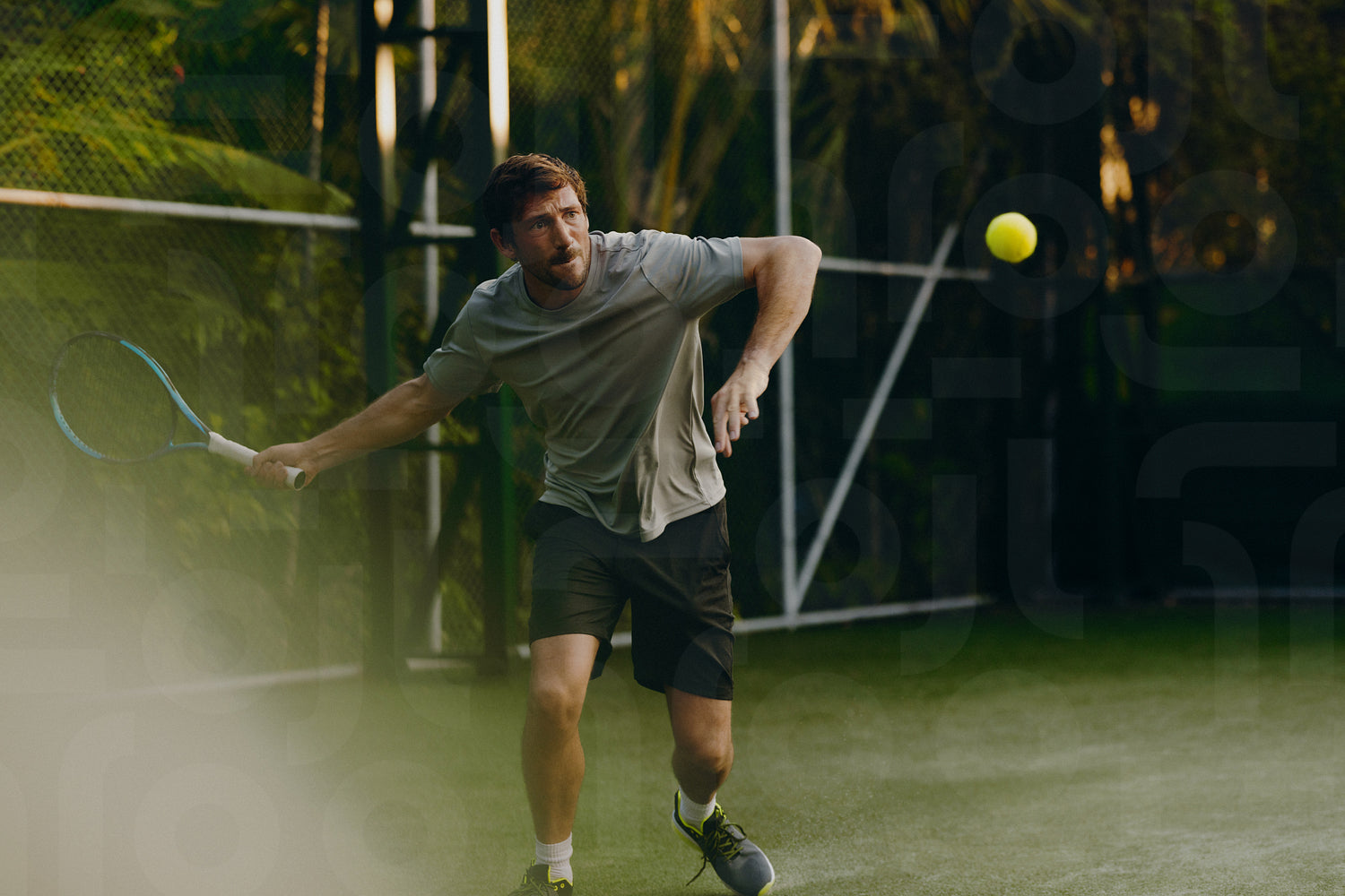 A man playing tennis at a resort on a lush island. The scene captures his focus and athleticism as he follows through after hitting the ball. The setting contributes to the tropical resort ambiance.