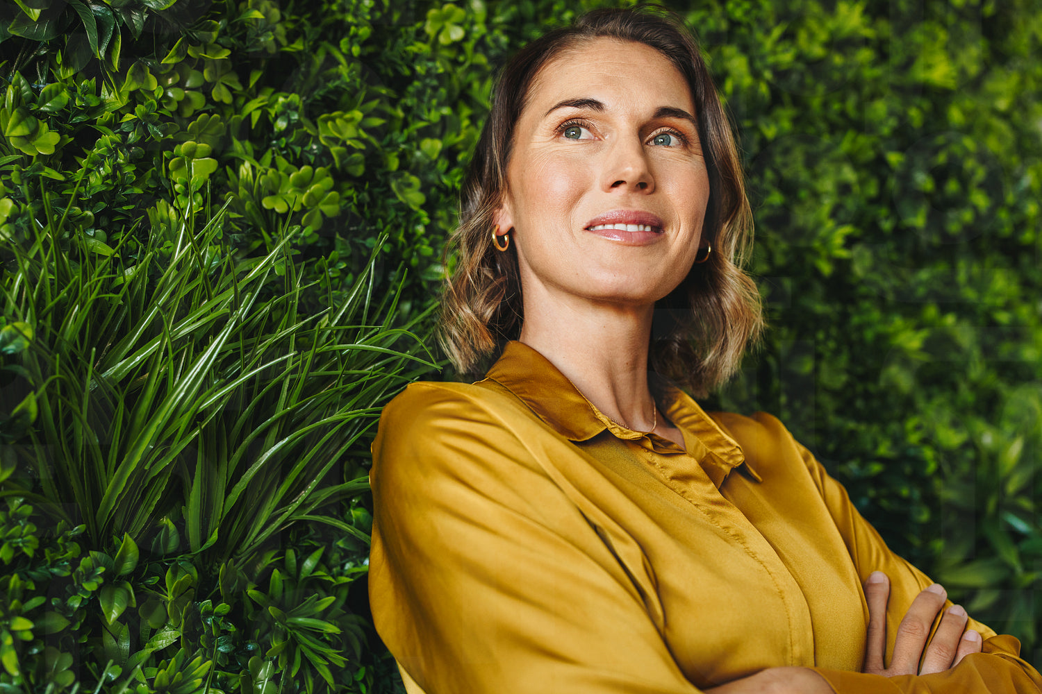 Company owner stands in a green office, with a thoughtful expression on her face. Business woman practicing entrepreneurship using sustainable and eco-friendly business values.
