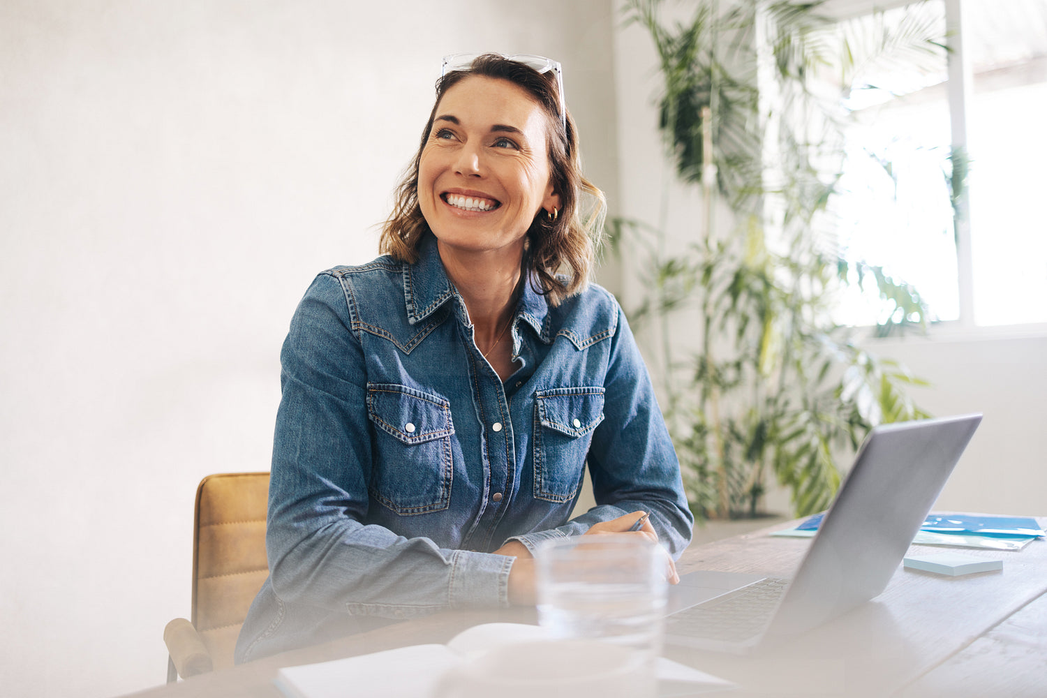 Thoughtful businesswoman sitting in her office with a warm smile on her face. Professional woman contemplating creative ideas for her business as an accomplished entrepreneur.