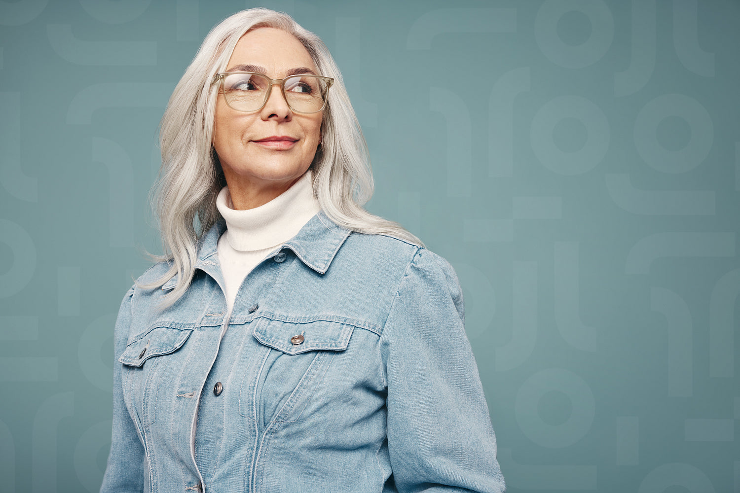 Thoughtful mature woman looking away. Grey-haired woman standing alone against a studio background. Strong independent woman feeling confident and empowered in a studio.