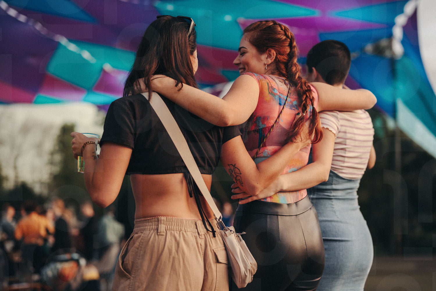 Three female friends come together in a warm embrace, their spirits lifted by the joyous atmosphere and immersive experiences of a blissful summer festival. This photo has intentional use of 35mm film grain.
