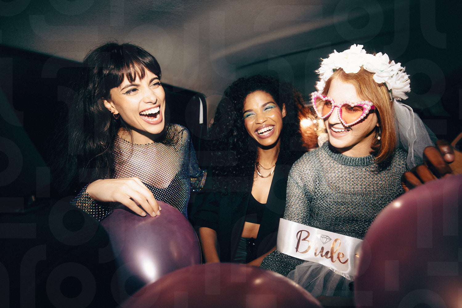 Three women celebrating a bachelorette party with joy and laughter in a car