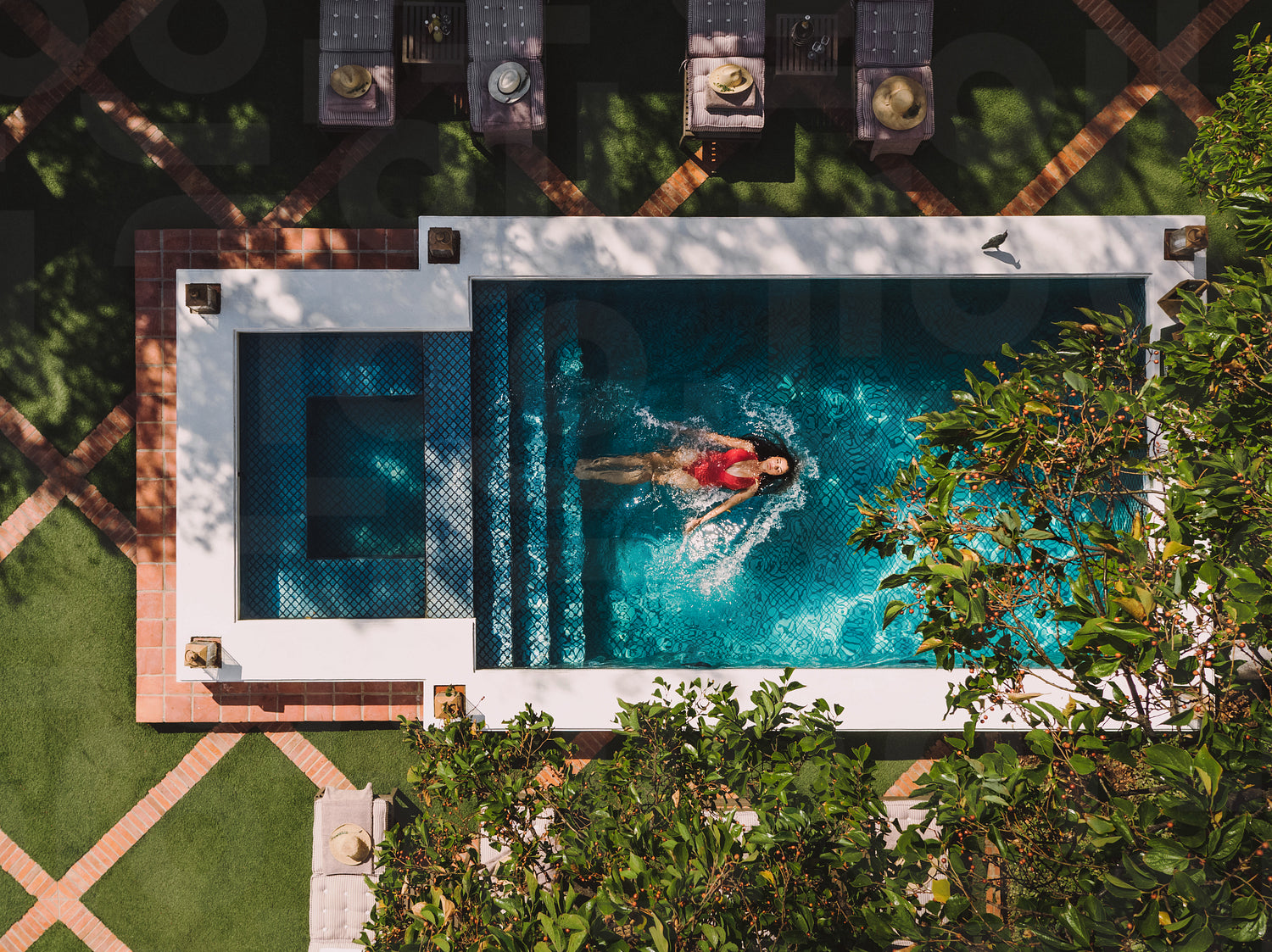Top view of a young tourist woman floating on the water while swimming alone. Attractive young woman unwinding in a pool at a luxury hotel. Young woman vacationing alone at a holiday resort.