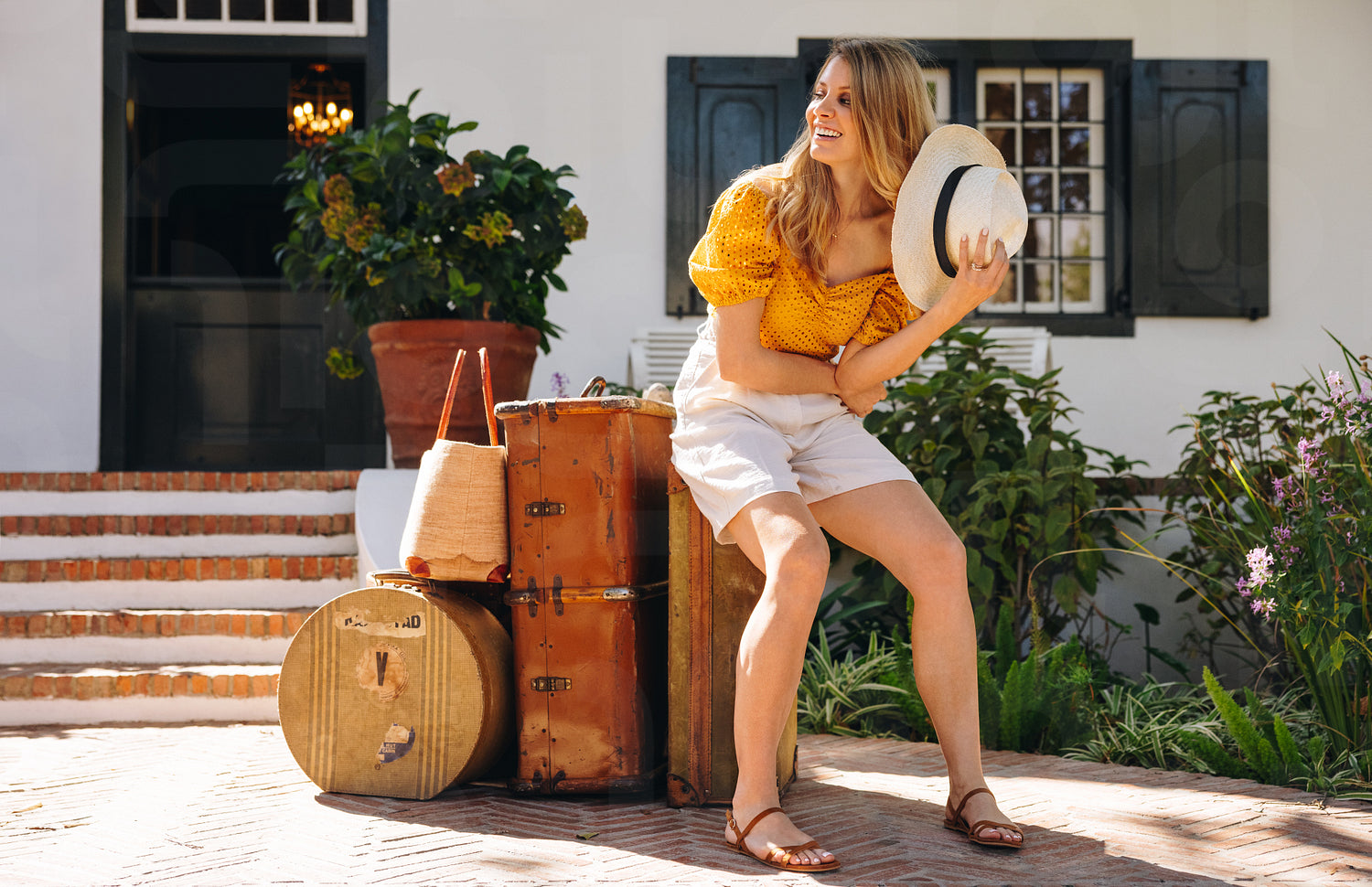 Tourist woman looking out for her ride outside a hotel. Happy female traveller smiling while sitting on top of her luggage outdoors. Woman leaving a luxury hotel after a fun summer vacation.