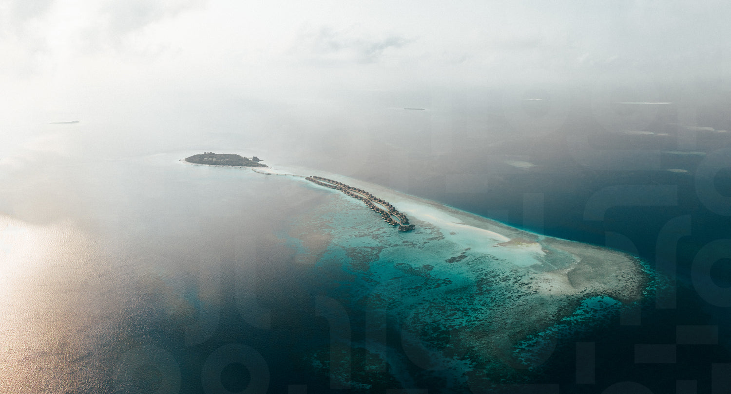 A tropical island resort in the Maldives, showcasing clear ocean waters, coral reefs, and sandy beaches.