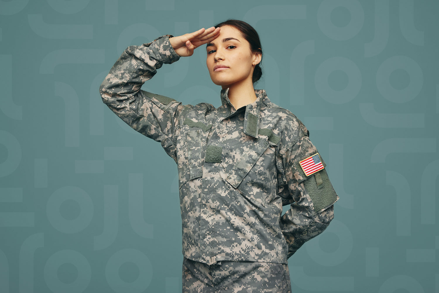 United States servicewoman saluting while standing against a studio background. Courageous young soldier wearing the camouflage military uniform of the United States Armed Forces.