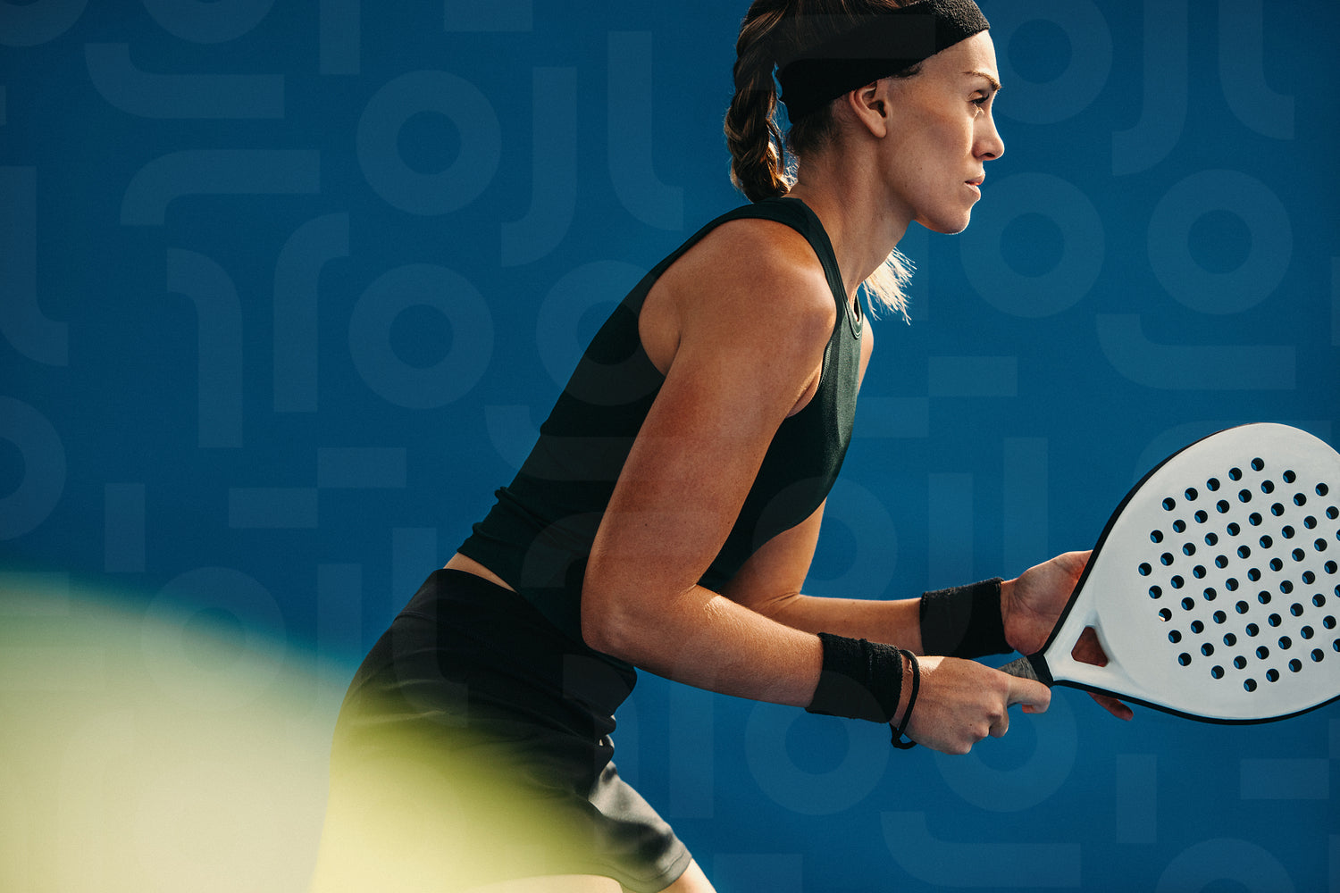 Padel player stands ready to conquer the padel court, holding her racket in position for the perfect stroke. Woman wearing sports clothing, confidently waiting for the padel serve during a game. This photo has intentional use of 35mm film grain.