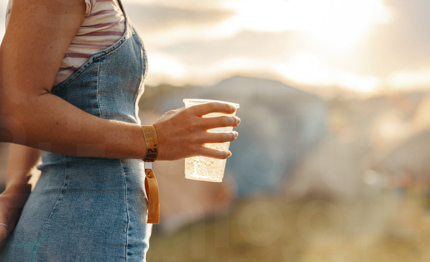 Woman grasps her alcohol drink in the lively backdrop of a summer festival camp, feeling the exhilarating energy in the air and getting ready to join the party. This photo has intentional use of 35mm film grain.